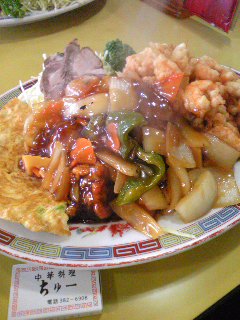 早速、定食注文、澄ました顔でおばさんが、ハンパない量のオカズを運んできました。天津、焼豚、酢豚、小エビの天ぷら、デカイ皿に、溢れんばかりのオカズ。写真に収まらん迫力、四十匹オーバーのエビ達が、皿から落ちそう。味は文句なしに旨し。さらに、国産野菜しか使わないというこだわりに、夏目さん1枚で、お釣りがでるという、泣かせるNiceプライス。懐寒い今年のクリスマスディナーは、吹田のちゅーできまり、おおきにです。もちろん、定食を二人で分けあう、夫婦善哉ならぬ、夫婦ちゅーです、失礼。